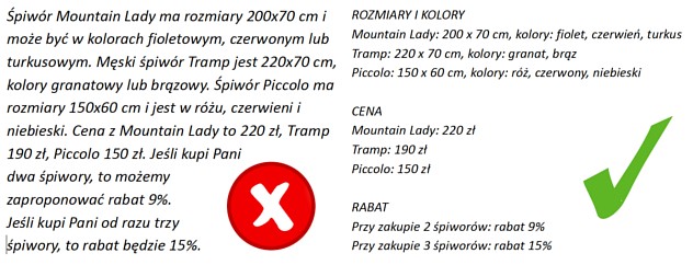 - listy numerowane i punktowane. Stosuj je zawsze, gdy tylko możesz. Wymieniasz cechy produktu? Zrób to w formie listy. Zadajesz pytania w celu rozwiązania problemu? Wylistuj je. Podajesz kilka form płatności? Lista będzie właściwa.