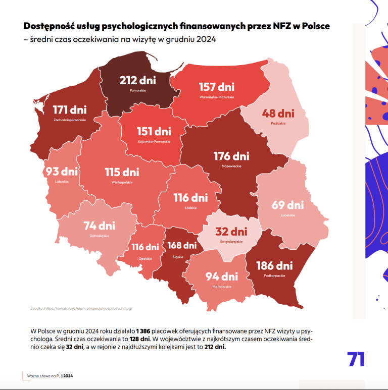 Polska znajduje się na jednym z ostatnich miejsc w Unii Europejskiej pod względem liczby psychiatrów. W 2022 roku na 100 tysięcy mieszkańców przypadało zaledwie 13,4 specjalistów. Ten niedobór kadr prowadzi bezpośrednio do dramatycznie długiego czasu oczekiwania na pomoc w ramach NFZ. Średni czas na umówienie wizyty u psychologa wynosił 128 dni. Tak odległe terminy uniemożliwiają szybką interwencję w kryzysie i pogarszają rokowania pacjentów.