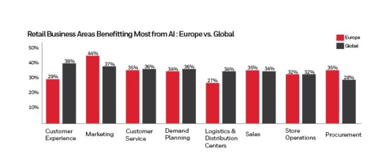 Europejskie firmy interesują się także możliwościami generatywnych agentów AI jako wsparcia dla pracowników sklepów. Mogą one służyć personelowi jako pomoc w szybkim odpowiadaniu na zapytania klientów, ale także przyspieszając procesy onboardingu. 36% detalistów w Europie (32% globalnie) uznało je za najważniejsze rezultaty wdrożeń AI. Na drugim miejscu znalazło się wykorzystanie sztucznej inteligencji do lepszego zarządzania zapasami i prognozowania popytu (36% w Europie, 33% globalnie). Planowanie pracy i optymalizację zasobów kadrowych wskazała jako najwyższy priorytet niemal jedna trzecia europejskich respondentów (31% wobec 26% globalnie).