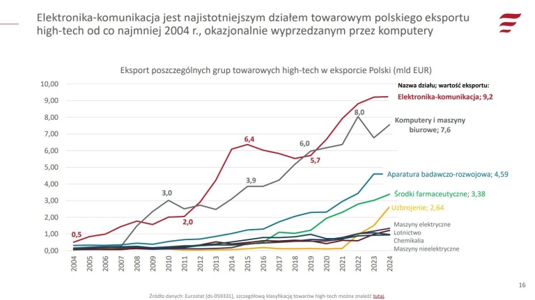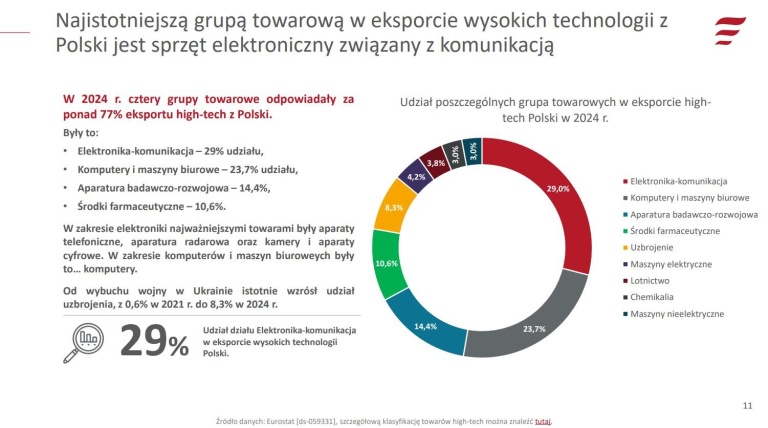 Z danych PFR wynika, że w 2024 roku cztery grupy towarowe odpowiadały za ponad 77% polskiego eksportu high-tech. Największy udział miały: elektronika i komunikacja (29%), komputery i maszyny biurowe (23,7%), aparatura badawczo-rozwojowa (14,4%) oraz środki farmaceutyczne (10,6%). Wśród produktów elektronicznych dominowały aparaty telefoniczne, urządzenia radarowe oraz kamery i aparaty cyfrowe.