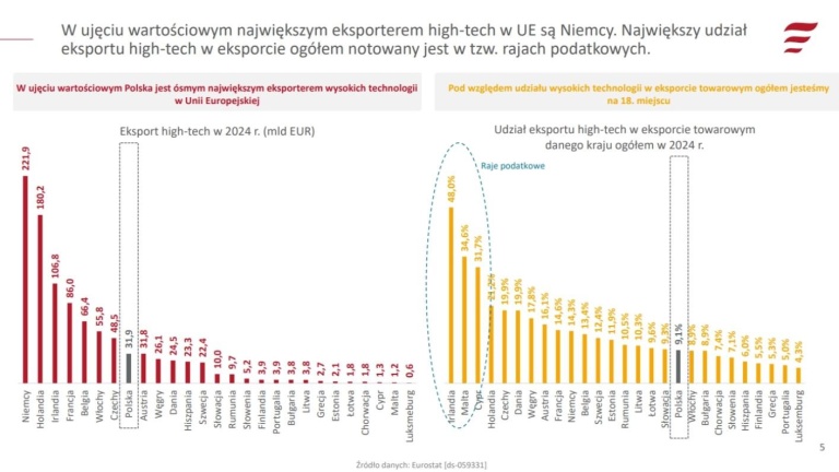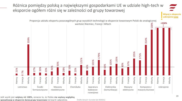 Poprzez obliczenie względnej specjalizacji w eksporcie high-tech, analitycy zwrócili uwagę na to, że Polska od 2014 roku jest bardziej wyspecjalizowana w eksporcie wysokich technologii niż Włochy, systematycznie doganiamy też Niemcy i Francję: