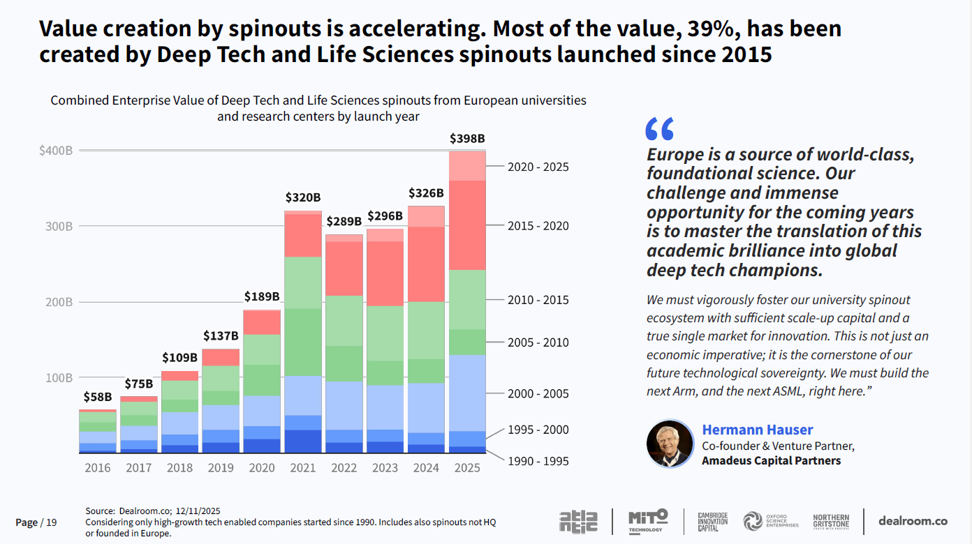 Najbardziej uderzający wniosek raportu dotyczy skali. Spinoffy akademickie z europejskich uczelni i instytutów badawczych w obszarze deep tech i life sciences są dziś warte niemal 400 mld dolarów i odpowiadają za ponad 84% całkowitej wartości tworzonej przez europejskie spinoffy. Co więcej, 39% tej wartości powstało w firmach założonych po 2015 roku, co wskazuje na wyraźne przyspieszenie procesu komercjalizacji badań naukowych. Zmienia się także struktura ekosystemu. Spinoffy odpowiadają obecnie za 40% nowych startupów deeptech i life sciences powstałych w Europie po 2019 roku – to aż o 80% więcej niż w latach 2010–2018. Innymi słowy: bez spinoffów nie da się dziś mówić o europejskim deeptechu.