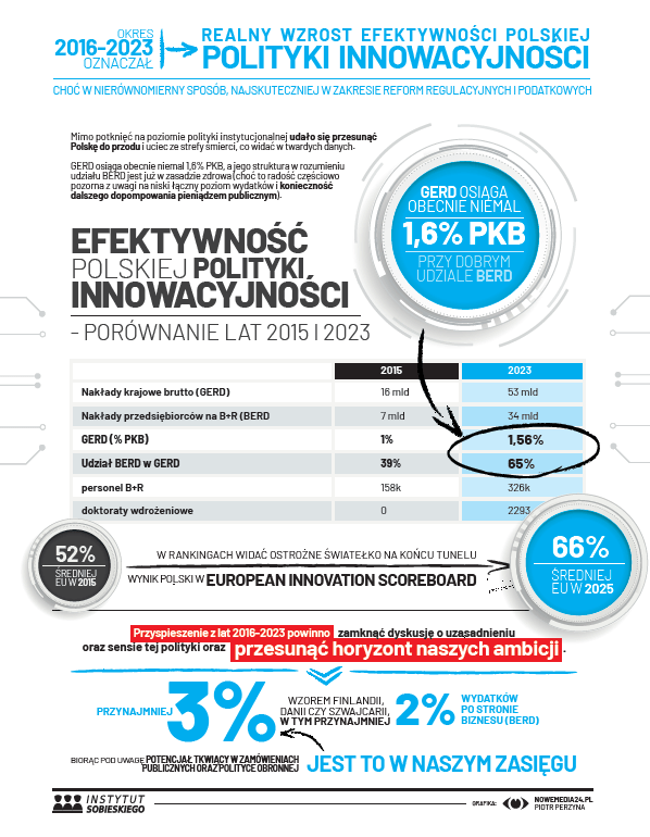 W rozdziałach otwierających raport autorzy pokazują dekadę 2015–2025 jako „bieg przez płotki”: od niskiej bazy (ok. 1% PKB na B+R) do wyraźnego wzrostu nakładów i nowych instrumentów (ulgi B+R, budowa rynku VC przez PFR Ventures, PSA). Widać to też w statystykach publicznych: GUS podaje, że w 2023 r. GERD wyniósł 53,1 mld zł, a intensywność B+R 1,56% PKB. Dane raportu są spójne z tym obrazem i mocno podkreślają rosnący udział firm w finansowaniu B+R. Jednocześnie, autorzy raport uczciwie przyznają: to nadal w dużej mierze innowacyjność „adaptacyjna” (usprawnienia procesowe), a nie przełom. Symbolicznie pokazują to wskaźniki „wyjścia”: niska liczba zgłoszeń do EPO per capita, niski udział high-tech w eksporcie, słaba innowacyjność zamówień publicznych oraz długie procedury oceny projektów.