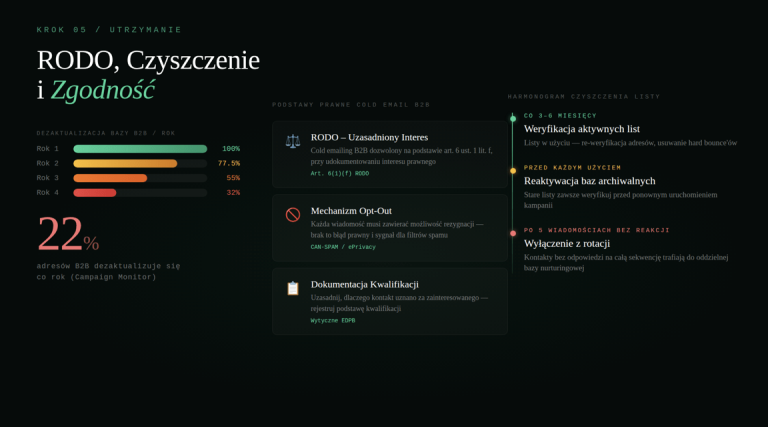 Listy aktywnie używane warto weryfikować co 3–6 miesiÄ™cy. Listy „archiwalne” — przed każdym ponownym użyciem, niezależnie od upÅ‚ywu czasu. Kontakty, które nie zareagowaÅ‚y na żadnÄ… z piÄ™ciu wiadomoÅ›ci w sekwencji, należy wyłączyć z rotacji, a nie ignorować jako szum statystyczny.