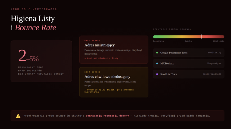 Surowa lista nie nadaje siÄ™ do użycia. Każdy nieaktywny lub błędny adres podnosi współczynnik bouncy, a przekroczenie progu 2–5% hard bounce’ów skutkuje degradacjÄ… reputacji domeny nadawcy — niekiedy trwałą.