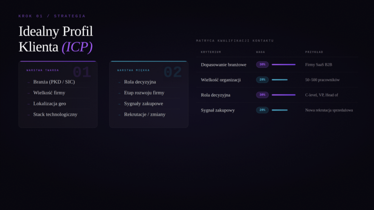 Idealny profil klienta (ICP) buduje się dwuwarstwowo. Pierwsza warstwa to dane twarde: branża (według kodów PKD lub SIC), wielkość firmy mierzona przychodami lub liczbą pracowników, lokalizacja geograficzna, stosowane technologie (stack technologiczny można identyfikować narzędziami jak BuiltWith lub Wappalyzer).