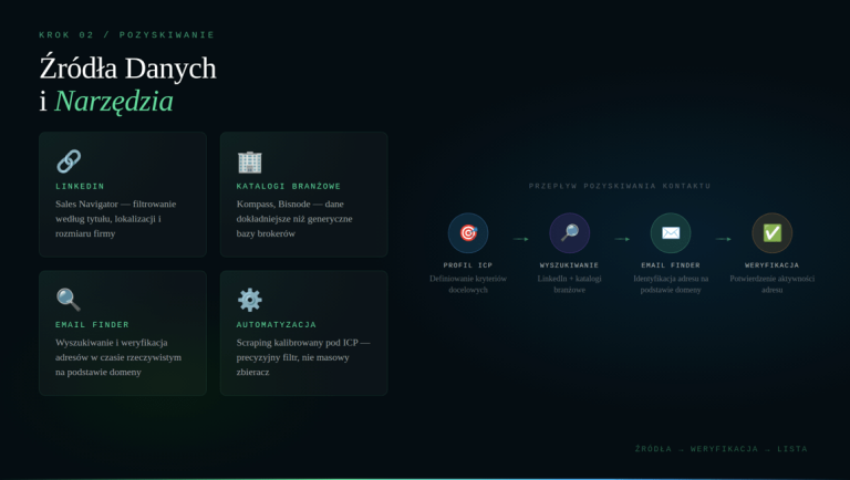 Skuteczna lista do cold emailingu to produkt czterech etapów: precyzyjnego ICP, wiarygodnych źródeł danych, rygorystycznej weryfikacji i przemyślanej segmentacji. Każdy pominięty etap obniża efektywność kampanii bardziej niż zły temat wiadomości czy nieudany CTA. Lista mailingowa jest infrastrukturą — i powinna być traktowana z taką samą starannością jak każda inna część stosu technologicznego.