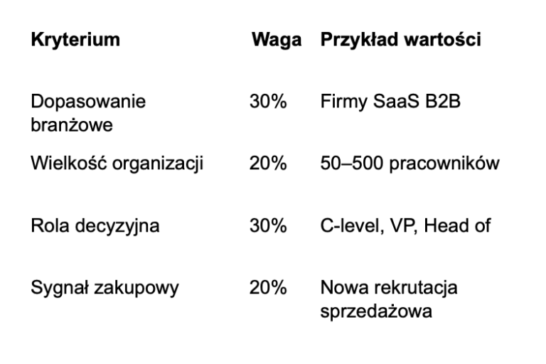 Praktycznym narzędziem jest prosta matryca z progiem punktowym. Kontakty poniżej progu trafiają do osobnej bazy do późniejszego nurturingu, a nie bezpośrednio na listę cold email. To pozwala utrzymać wskaźnik odpowiedzi na poziomie uzasadniającym koszty kampanii.