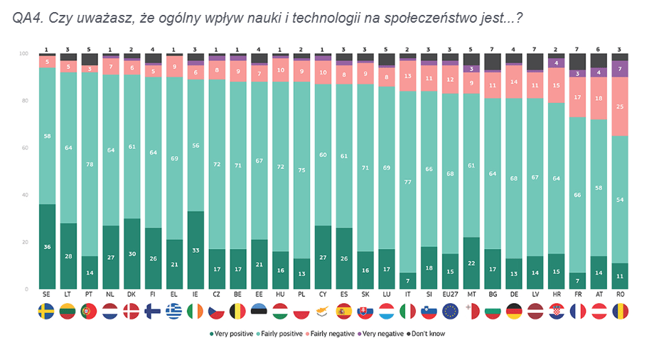 Według badań, 83% obywateli uznaje, że ogólny wpływ nauki i technologii na społeczeństwo jest pozytywny. Ponadto, 67% respondentów zgadza się, że nauka i technologia przyczyniają się do ułatwienia, poprawy zdrowia i wygody życia codziennego.