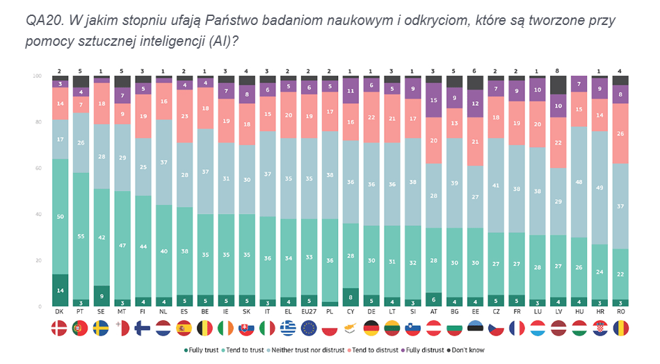 W kontekście wykorzystania sztucznej inteligencji (AI) do badań naukowych, wyniki są mieszane. 38% respondentów wyraża zaufanie do badań i odkryć stworzonych przy użyciu AI, podczas gdy 25% nie ufa tego typu badaniom.