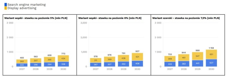 W raporcie przeanalizowano również wariant wąski, który dotyczyłby ukierunkowanej reklamy cyfrowej. Tutaj stawki miałyby wynosić 5 proc., 6 proc. lub – rekomendowana – 7,5 proc.  W tym przypadku, podobnie jak w wariancie szerokim, próg dla przychodu z usług cyfrowych w skali globalnej wynosiłby 750 mln euro. Przychody zaś szacowałyby się w taki sposób: przy stawce 5 proc.: 482 mln zł w 2027 r. i 772 mln zł w 2030 r., przy stawce 6 proc.: 578 mln zł w 2027 r. i 927 mln zł w 2030 r., zaś w przypadku 7,5 proc. – 722 mln zł w 2027 r. i ok. 1,6 mld zł w 2030 r.