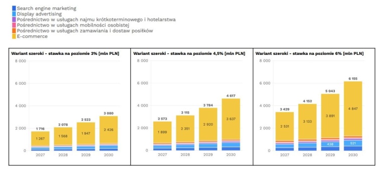 W przypadku stawki 4,5 proc. w 2027 roku z tytułu podatku cyfrowego do budżetu państwa mogłoby wpłynąć ok. 2,6 mld zł, a w 2030 r. 4,6 mld zł. Natomiast przy stawce 6 proc. – w 2027 roku mogłoby to być ok. 3,4 mld zł, a w 2030 roku 6,15 mld zł.
