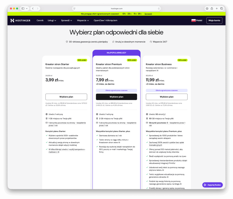 Trzeci etap to zapewnienie przestrzeni w sieci dla powstającej strony. To już domena serwisu Hostinger, któremu warto powierzyć to zadanie. Oferowana usługa hostingu jest szybka, a przede wszystkim bezpieczna.