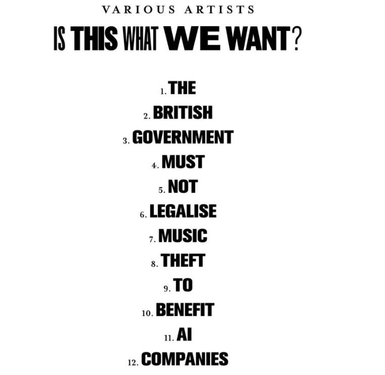 Wspomniane piosenki w wielu przypadkach były jedynie efektem zabawy z AI. Lecz z pozoru niewinne utwory, mogą stać się prawdziwym zagrożeniem dla popularnych wokalistów. Na początku 2025 roku ponad 1000 artystów, takich jak Annie Lennox, Damon Albarn i Kate Bush, wydało niemy album w ramach protestu przeciwko planowanym przez rząd Wielkiej Brytanii zmianom w prawie autorskim. Zgodnie z nowymi przepisami platformy AI będą mogły wykorzystywać utwory znanych artystów dostępne w Internecie do rozwijania swoich modeli, chyba że właściciele praw autorskich postanowią inaczej.