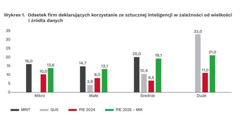 Wykorzystanie AI w polskich przedsiębiorstwach jest zróżnicowane i zależne od wielkości podmiotu oraz metodologii badania. Dane z Głównego Urzędu Statystycznego, na które powołuje się PIE, wskazywały, że w 2024 roku jedynie 5,9% firm korzystało z AI. Z kolei analizy PIE i Ministerstwa Rozwoju u Technologii wskazują, że AI się da do 16% mikrofirm i 15% małych przedsiębiorstw. Najnowsze dane z Miesięcznego Indeksu Koniunktury PIE sugerują też, że sztuczna inteligencja zyskuje na popularności wśród firm średnich (19%) i dużych (21%).