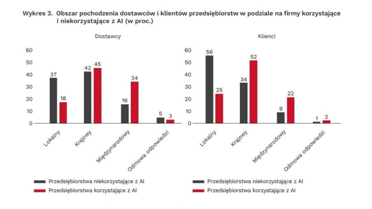 Zaledwie od 6 do 16% polskich firm korzysta z rozwiązań opartych na sztucznej inteligencji, a aż 77% tych, które ich nie stosują, nie planuje wdrożeń, dopóki nie będzie to absolutnie konieczne. Jak wynika z raportu Polskiego Instytutu Ekonomicznego (PIE) „AI w polskich przedsiębiorstwach”, adopcja technologii zależy od stopnia cyfryzacji, kompetencji kadry i powiązań międzynarodowych. Przedsiębiorstwa stosujące AI blisko 2,5 razy częściej obsługują klientów zagranicznych i ponad dwukrotnie częściej współpracują z dostawcami spoza Polski niż te, które nie wdrożyły tych rozwiązań.