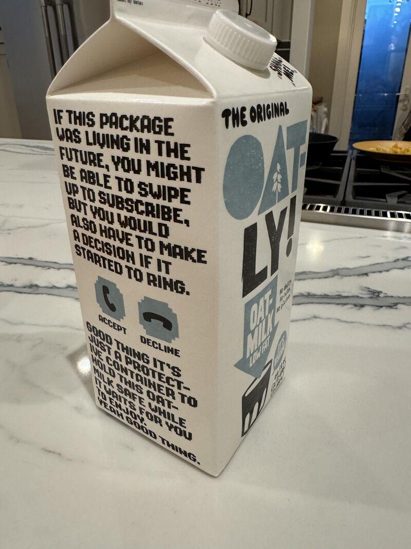 Jeśli mieliście okazję czytać teksty na opakowaniach Oatly, wiecie, że różnią się one od tego, co jest drukowane na klasycznych mlecznych kartonach. To, co wstawia tam Oatly, to mikroeseje. Długie teksty, ironiczne komentarze o własnej komunikacji, meta żarty o tym, że „marketingowiec każe ci czytać karton”.