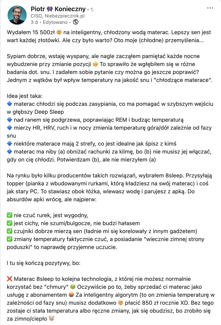Piotr Konieczny przetestował materac za kosmiczną sumę, żebyśmy my nie musieli. Kupujesz materac za ponad 15l, żeby spać jak król. Później odkrywasz, że ten król musi płacić 850 zł rocznie abonamentu za… automatyczne zmienianie temperatury, które NIE DZIAŁA TAK DOBRZE.