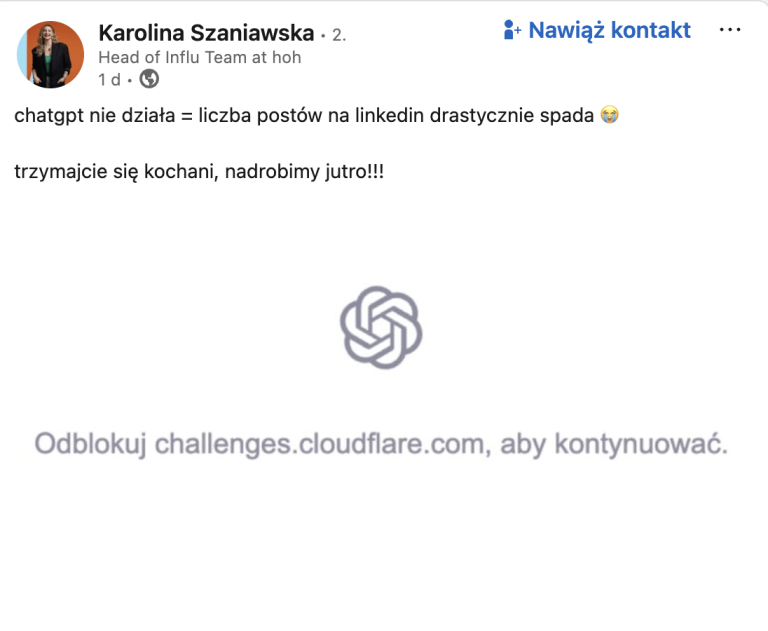 W minionym tygodniu był jeden taki dzień, który sprawił, że niektóre strony zaczęły padać, w tym, podobno, ChatGPT. Jedna z Linkedinowiczek zauważyła ciekawą korelację. W dniu awarii pojawiło się mniej postów! Teorii spiskowych snuć nie będziemy, bo niby co? Większość postów na Linkedinie opiera się na LLMach?