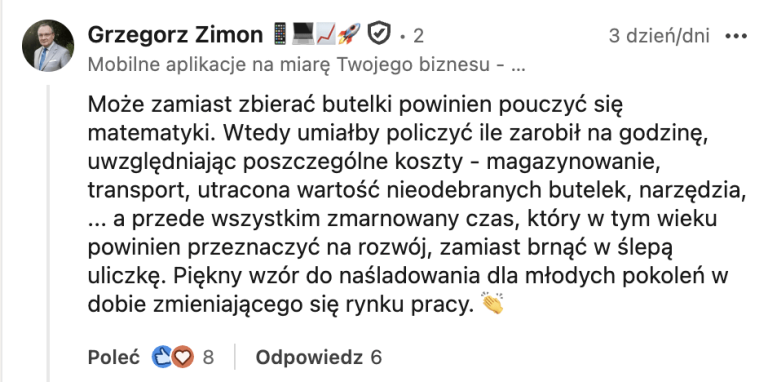 No pewnie! Zamiast zarobić na konsolę czy nowe buty, lepiej zostać młodym rekinem biznesu, który nie ruszy się z kanapy, póki stawka godzinowa nie uwzględni „utraconej wartości nieodebranych butelek”. Bo przecież w dobie AI i cyfryzacji, zbieranie realnej gotówki z ziemi to „ślepa uliczka”.