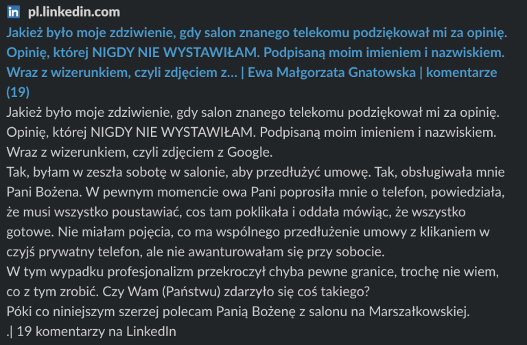 Przeglądając Linkedina czasami człowiek trafia na różne dziwne rzeczy. Naszej uwadze nie umknął post Ewy Gnatowskiej (w bio Risk Manager), która to poszła przedłużyć umowę. W opowieści, Risk Managerka oddaje na chwilę telefon w ręce Pani Bożeny z salonu, by po chwili odkryć, że z jej konta dodano pochlebną opinię o Pani Bożenie. Pani Bożena z salonu wstawiła sobie laurkę z prywatnego konta klientki, polecając siebie samą.