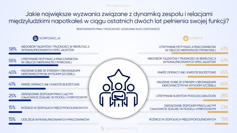 58% liderek w korporacjach i 47% w startupach wskazuje niedobór talentów jako główne wyzwanie ostatnich dwóch lat. To nie jest problem tylko polskiego rynku – to globalne zjawisko. Dodatkowo 63% liderek startupów i 55% w korporacjach ma problem z utrzymaniem motywacji zespołów w czasach niepewności rynkowej. Firmy konkurują już nie tylko produktami, ale przede wszystkim o najlepsze kadry. Kto nie nauczy się zatrzymywać talentów, może przegrać wyścig technologiczny.