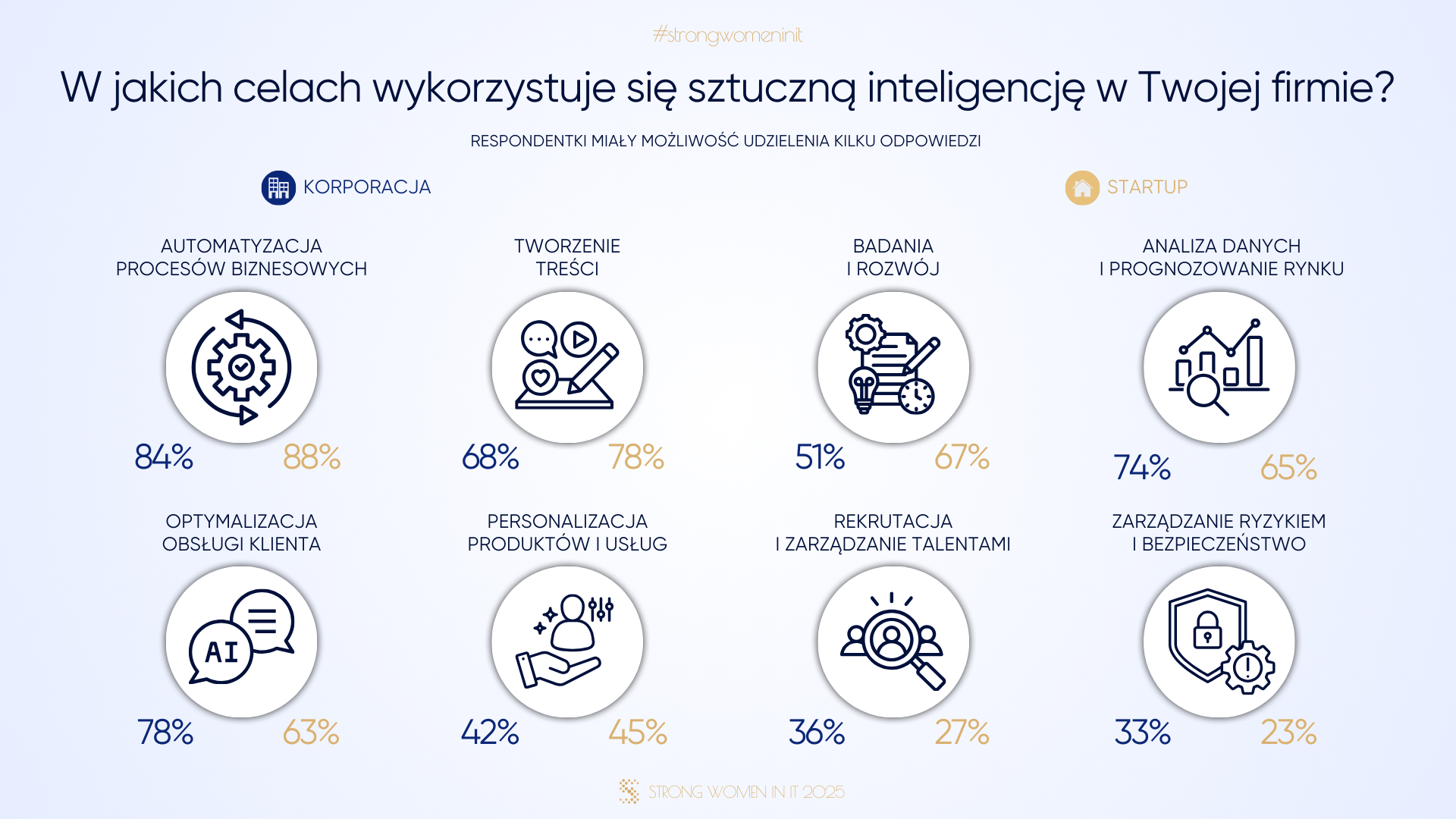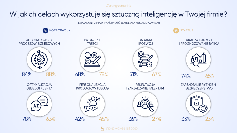 Niemal wszystkie liderki (96% w startupach, 97% w korporacjach) wskazują sztuczną inteligencję jako kluczowy trend branży. To pokazuje, jak powszechna jest świadomość rewolucji AI. AI już dziś jest używana w konkretnych obszarach – w startupach przede wszystkim do automatyzacji procesów biznesowych (88%) i tworzenia treści (78 %), podczas gdy korporacje stawiają na automatyzację procesów (84%) i optymalizację obsługi klienta (78%). Ciekawe, że startupy częściej wykorzystują AI w research and development (67% vs 51% w korporacjach).