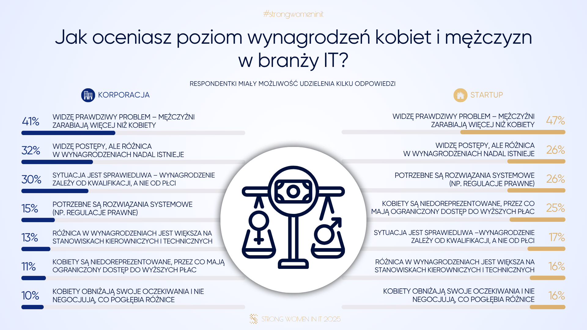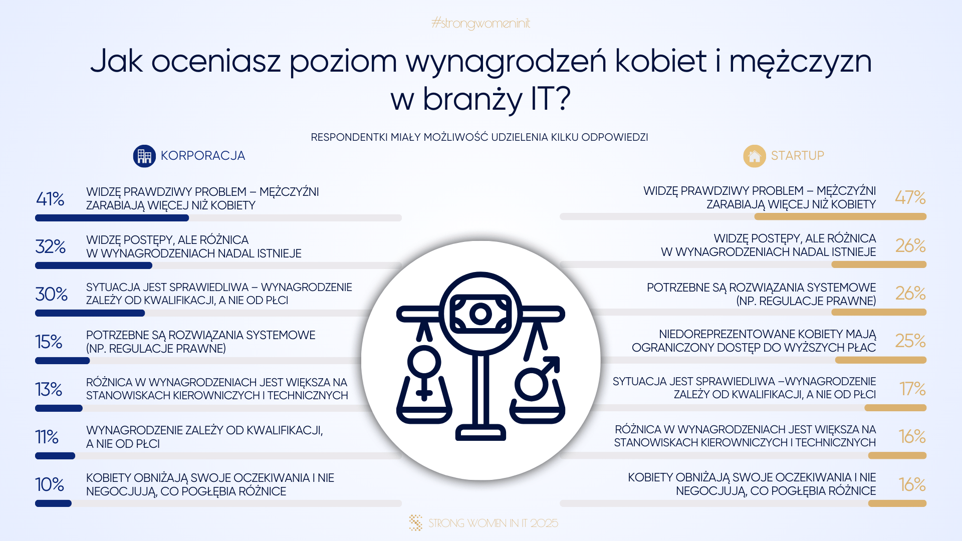 47% liderek w startupach i 41% w korporacjach widzi realny problem w dysproporcjach płacowych między kobietami a mężczyznami w IT, zatem inna płaca za tę samą pracę. Z kolei 29,5% kobiet z korporacji uważa, że sytuacja jest sprawiedliwa i wynagrodzenia zależą od kwalifikacji, a nie płci.