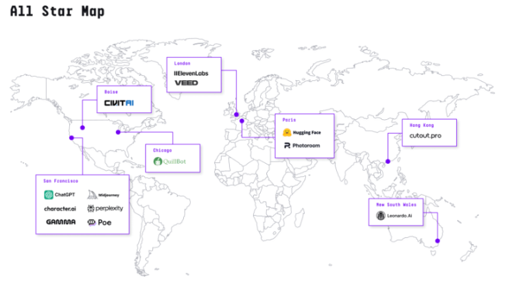 - nowe kategorie zyskują na popularności: to narzędzia dla deweloperów (agentic IDE), platformy typu text-to-web-app (automatyzacja tworzenia stron), rozwiązania graficzne i muzyczne