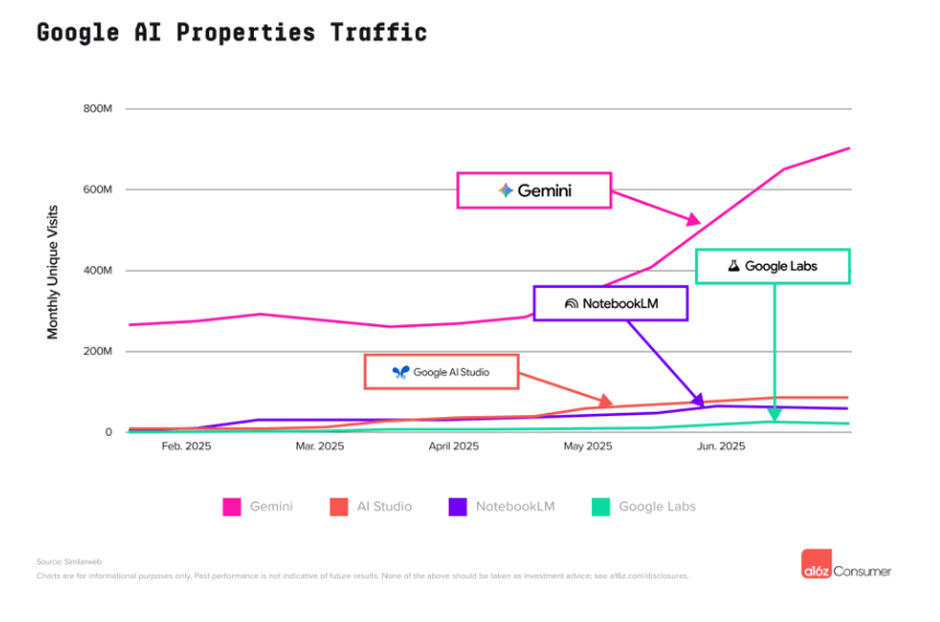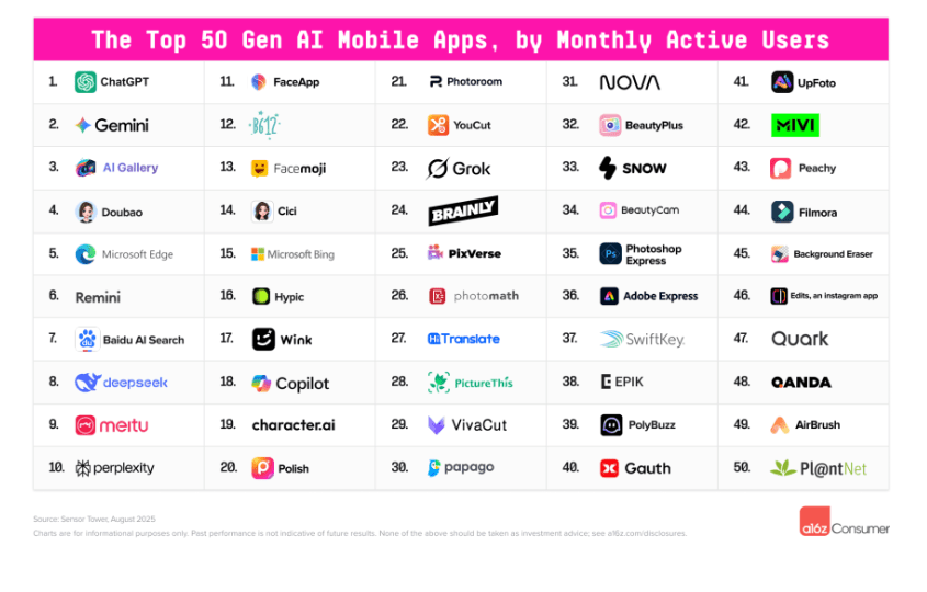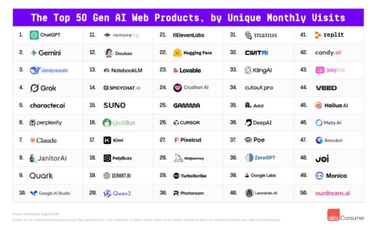 W tegorocznej edycji raportu zmieniła się metodologia: Google rozdzielił swoje produkty, dzięki czemu dziś każdy (jak Gemini, AI Studio itp.) można śledzić osobno. Zespół A16z wprowadził też tzw. “Brink List” – ranking aplikacji, które znalazły się tuż poza top 100, jak np. Lovable, PolyBuzz, Pixverse.