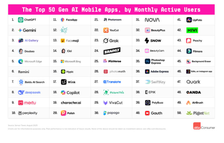 Według piątej edycji raportu, która analizuje dane z ostatnich 2,5 roku, ChatGPT wciąż króluje jako najważniejsza konsumencka aplikacja AI – zarówno webowa, jak i mobilna. Jednak jego pozycja lidera zaczyna być zagrożona. Google szybko wspina się w górę rankingu: zadebiutował aż czterema produktami — Gemini, AI Studio, NotebookLM i Google Labs (No. 39). Gemini na Androidzie zdominował rynek, zdobywając aż 90% swojej bazy użytkowników mobilnych właśnie na tej platformie.