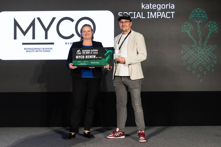 W tym roku laureatami zostali przedsiębiorcy z Myco Renew sp. z o.o. Startup opracował biotechnologiczny proces rozkładu trudnych mieszanek włókien (bawełna–poliester–elastan) z wykorzystaniem grzybów strzępkowych. Dzięki temu odpady tekstylne, które dotąd trafiały na wysypiska lub do spalarni, mogą być przetwarzane na biodegradowalne surowce gotowe do ponownego użycia. Technologia jest projektowana pod kątem wdrożeń przemysłowych i zgodności z regulacjami UE – w tym cyfrowego paszportu produktu, który umożliwia śledzenie pochodzenia materiałów. Rozwiązanie Myco Renew redukuje strumień odpadów i emisję CO₂, wzmacnia lokalne łańcuchy wartości, zwiększa transparentność w branży mody i promuje odpowiedzialną konsumpcję.