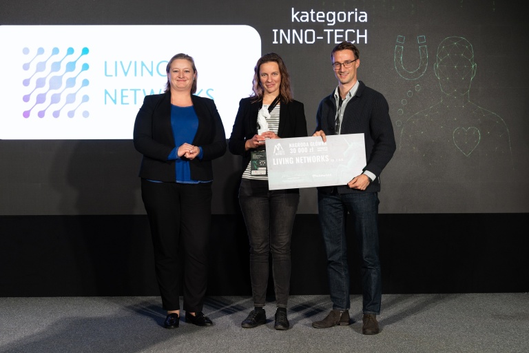 W tej kategorii zwyciężyła firma Living Networks sp. z o.o. Startup opracował platformę do testowania leków na unaczynionych ludzkich mikrotkankach 3D hodowanych w warunkach mikroprzepływowych. Kluczową rolę odgrywa technologia magnetycznej manipulacji mikronośnikami komórkowymi, która pozwala tworzyć realistyczne modele tkanek i wiarygodnie odwzorowywać reakcję organizmu na leki. Rozwiązanie zapewnia do 30 razy większą przepustowość i 10 razy mniejsze zużycie odczynników, co skraca czas badań i ogranicza konieczność testów na zwierzętach. To przełom w kierunku terapii spersonalizowanych – dzięki wykorzystaniu komórek pacjentów możliwy jest dobór leczenia jeszcze przed jego podaniem.